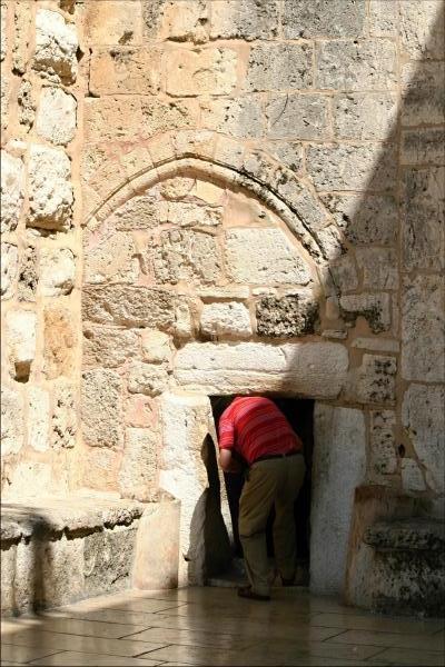 Původní vchod je dobře zřetelný, stejně jako křižácký vchod s lomeným obloukem. Protože do chrámu vjížděli jezdci na koních, což bylo považováno za jeho znesvěcení, byl vchod v osmanské době částečně zazděn a upraven do dnešní podoby.