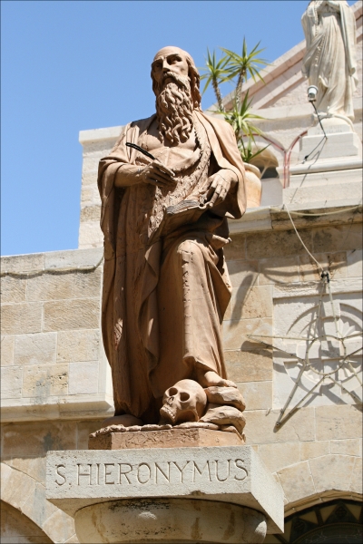 Sv. Jeroným se kolem roku 384 usadil v Betlémě. Jeho socha je na nádvoří, před vchodem do kostela Sv. Kateřiny. Pod kostelem jsou další jeskyně, v jedné z nich světec žil a nakonec byl i pohřben. Není bez zajímavosti, že právě zde svatý Jeroným strávil mnoho let překladem Bible do latiny.