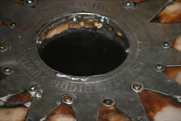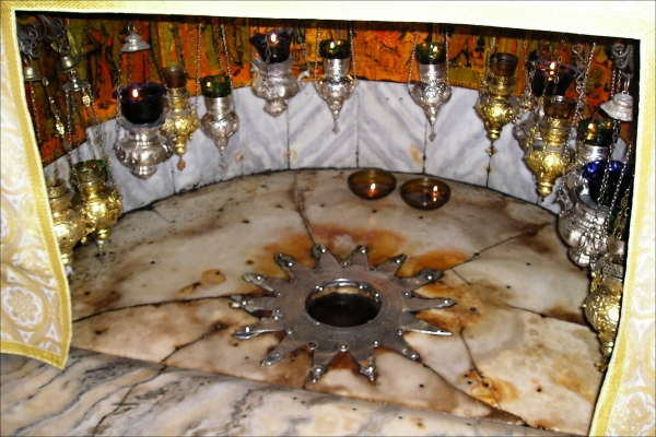 Stříbrná hvězda označuje přesné kísto narození Ježíše v jeskyni Narození. Je na ní latinský nápis "Hic de Virgine Maria Jesus Christus natus est 1717".