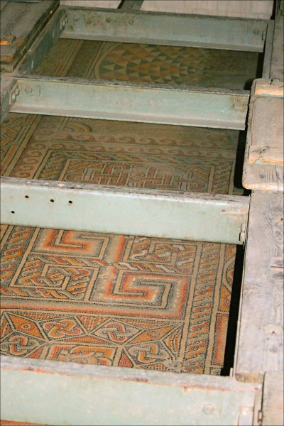 Mozaika, dnes ukrytá pod rozkládací dřevěnou podlahou, pochází ze 4. století. Pozoruhodně složité geometrické tvary a barevné provedení.